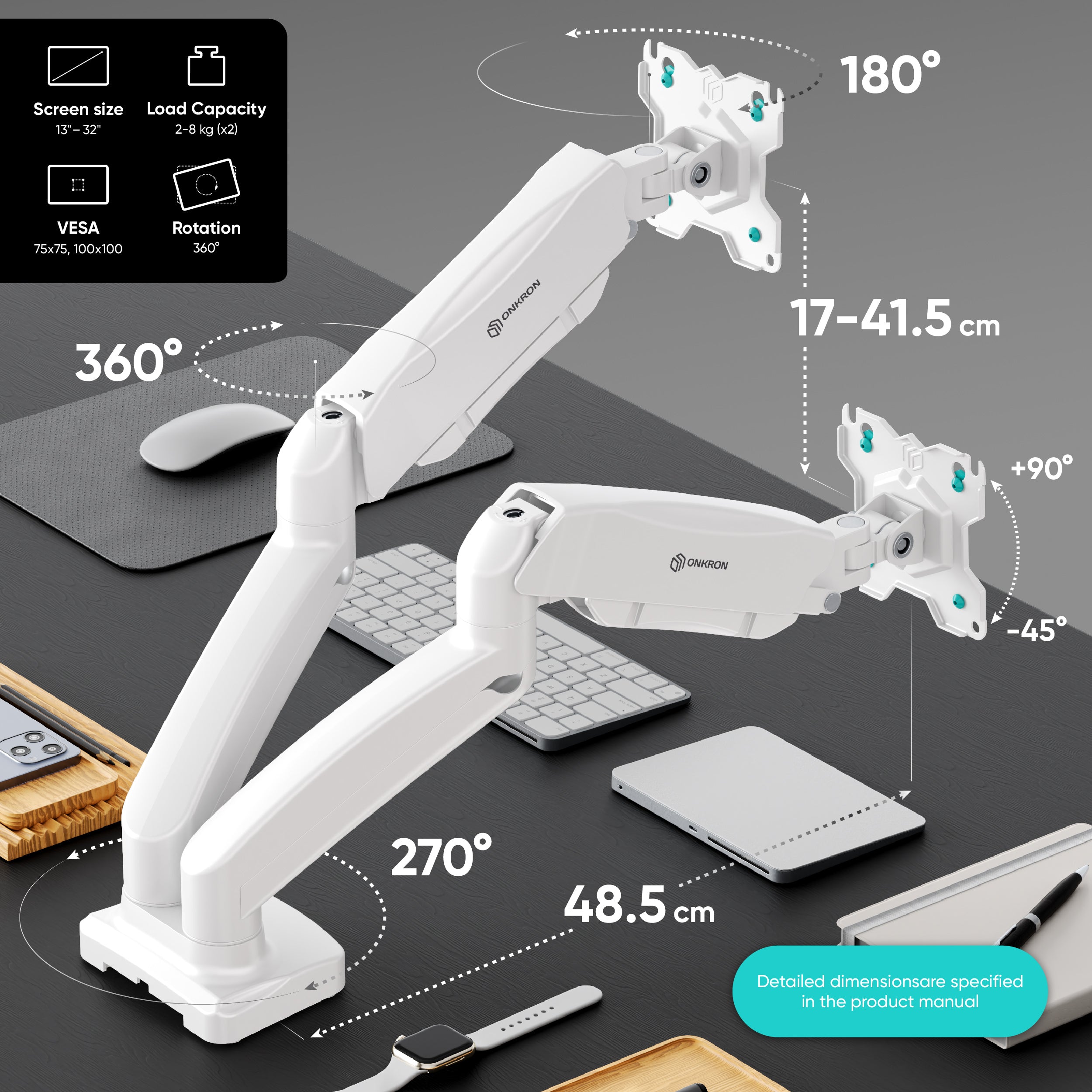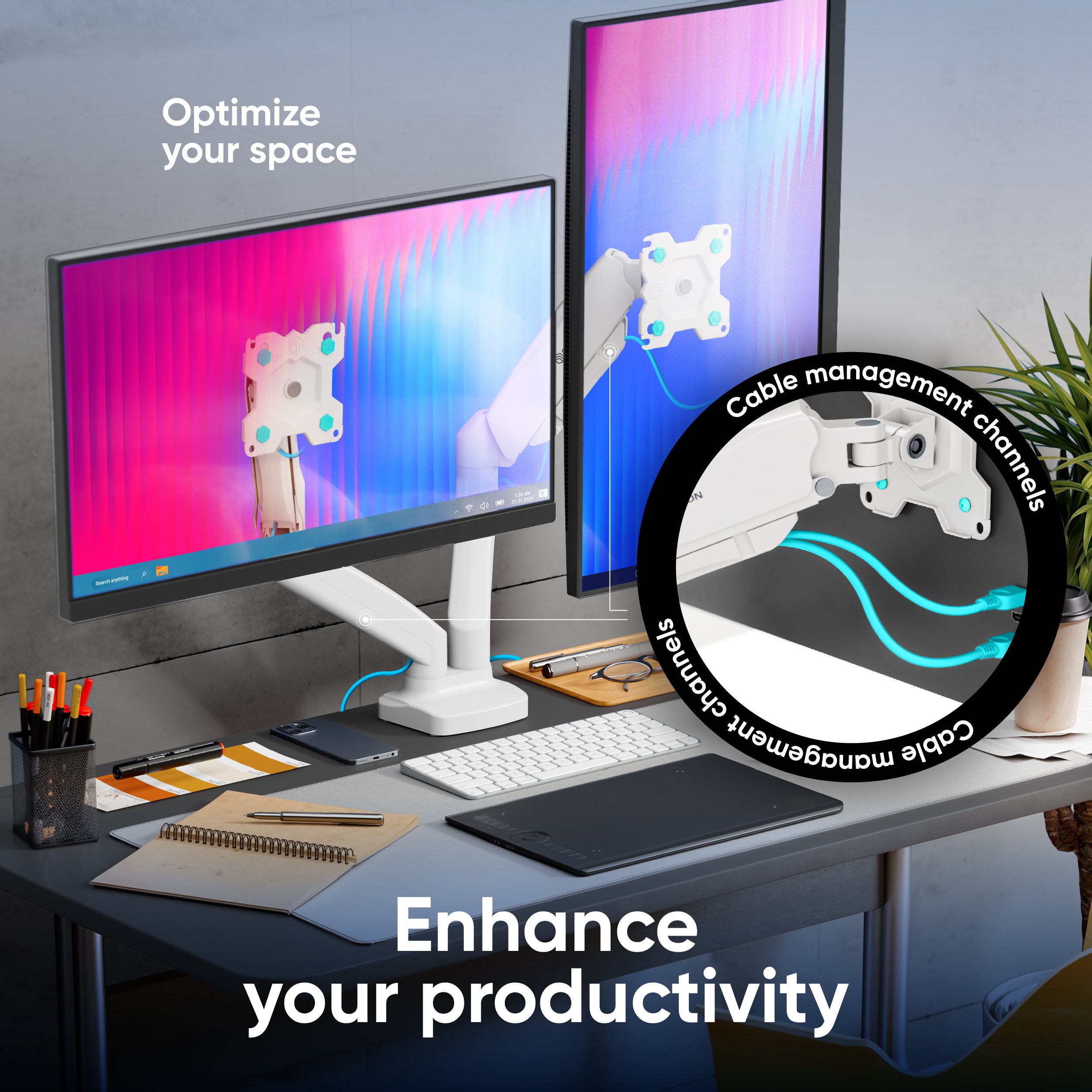 Si muovono in modo indipendente, dietro i cavi passano dentro e non si vedono. Tiene bene (ho messo una tv da 32 e uno schermo da 27). Ottimo acquisto.